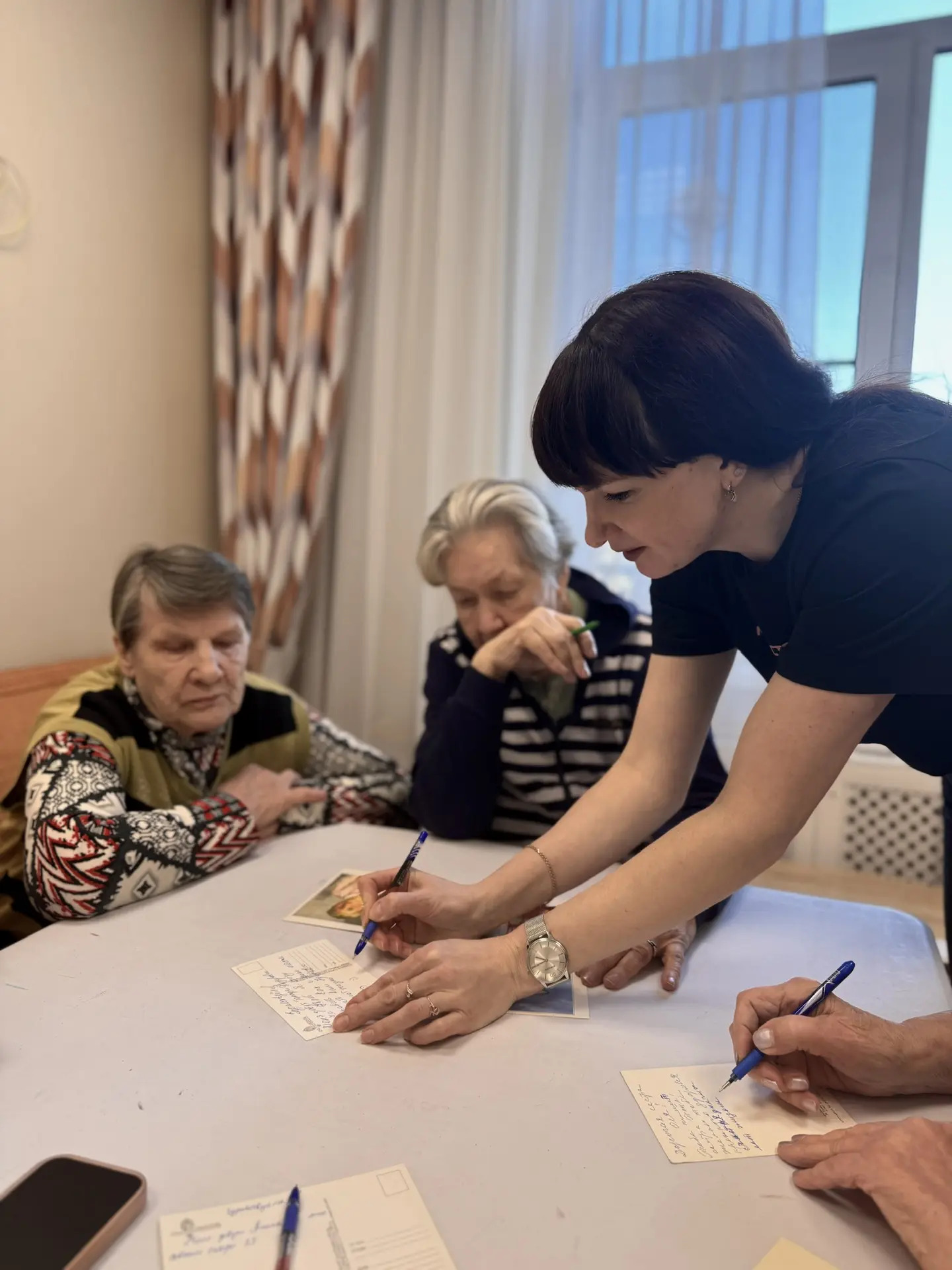 Если с пансионатами все более-менее понятно, то для надомного обслуживания требуется анонсирование акции и рассказ о проекте сиделкам, чтобы те могли помочь бабушкам и дедушкам, которые хотят общаться, но в силу разных обстоятельств написать самим им тяжело или вовсе не могут. В этом проекте социальный работник становится «почтальоном». Это уже не просто доставка продуктов, а настоящий ритуал: принести чистую открытку, помочь сформулировать мысль (если есть проблемы с моторикой или зрением), забрать ее и передать сотруднику социального отдела.